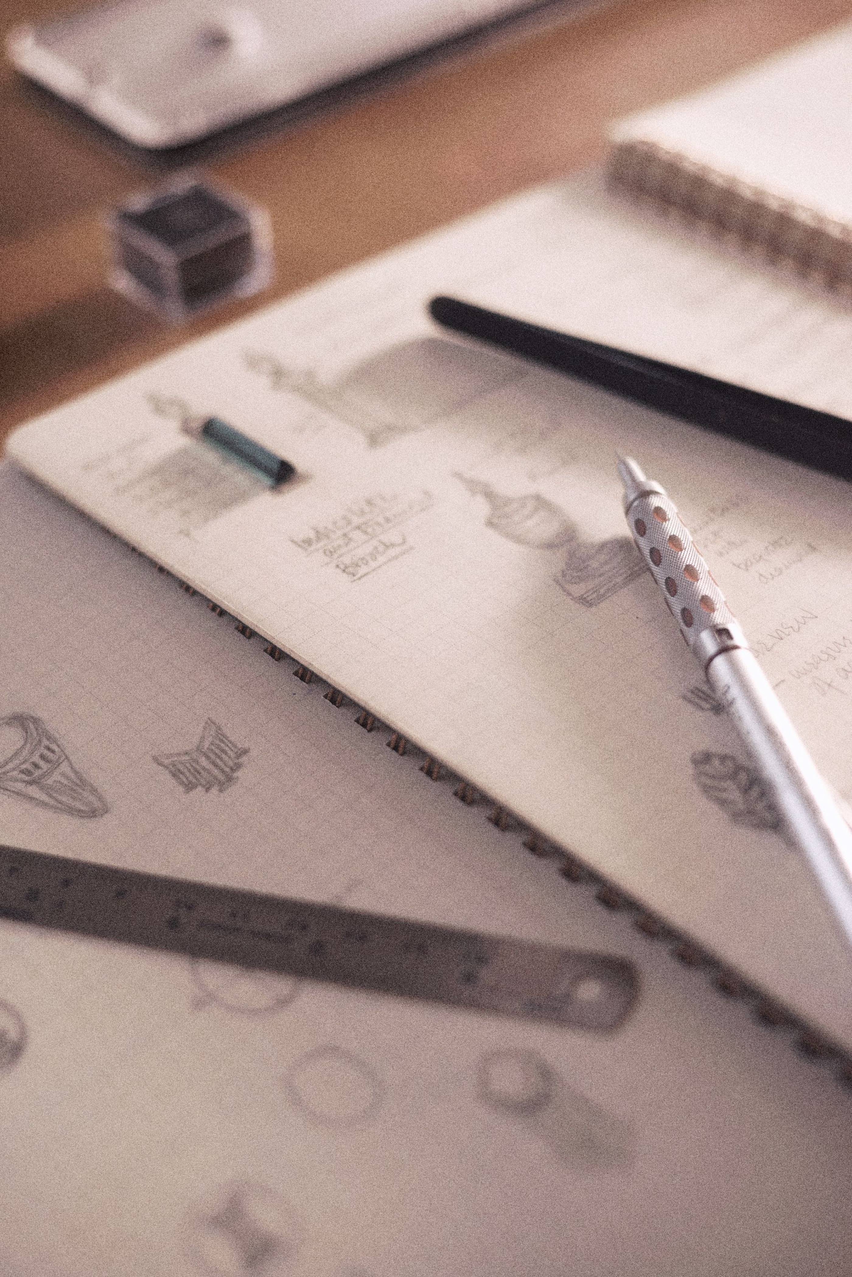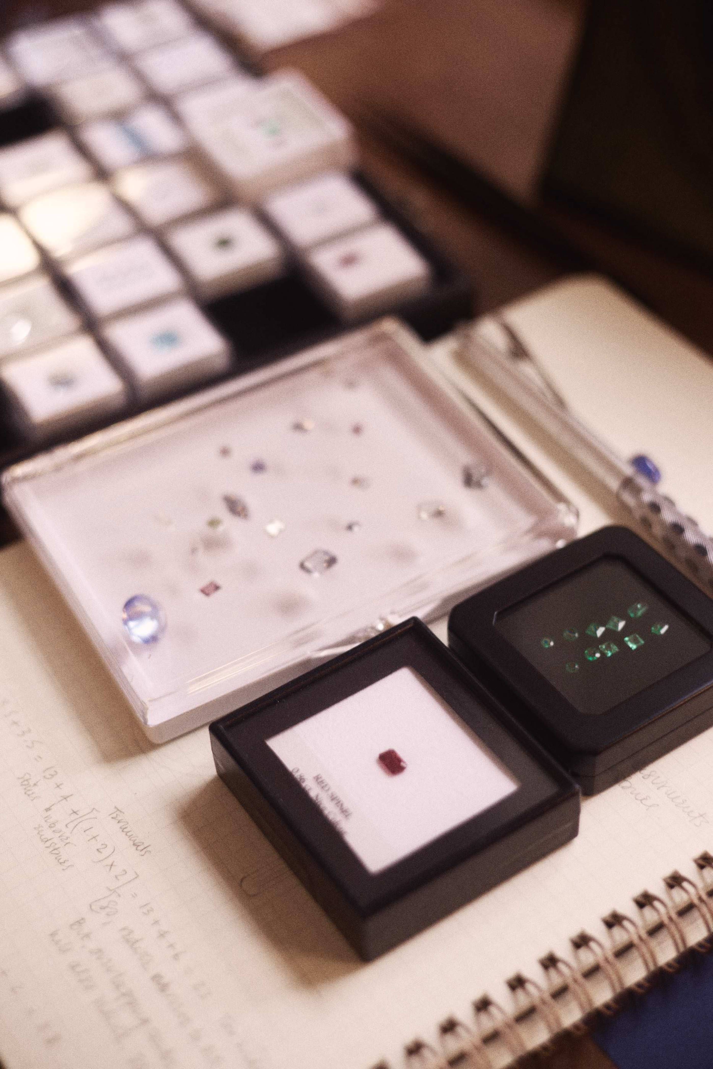 Where possible, we will use physical samples - of metal weights, of cuts of stone, of styles - and after a conversation with Jane, you will have a strong idea of what she can achieve for you. Then the design process can begin...